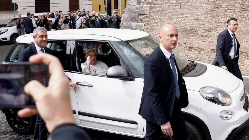 He was seen smiling and waving from the car, before getting out to speak to a crowd. He then headed for the Vatican.